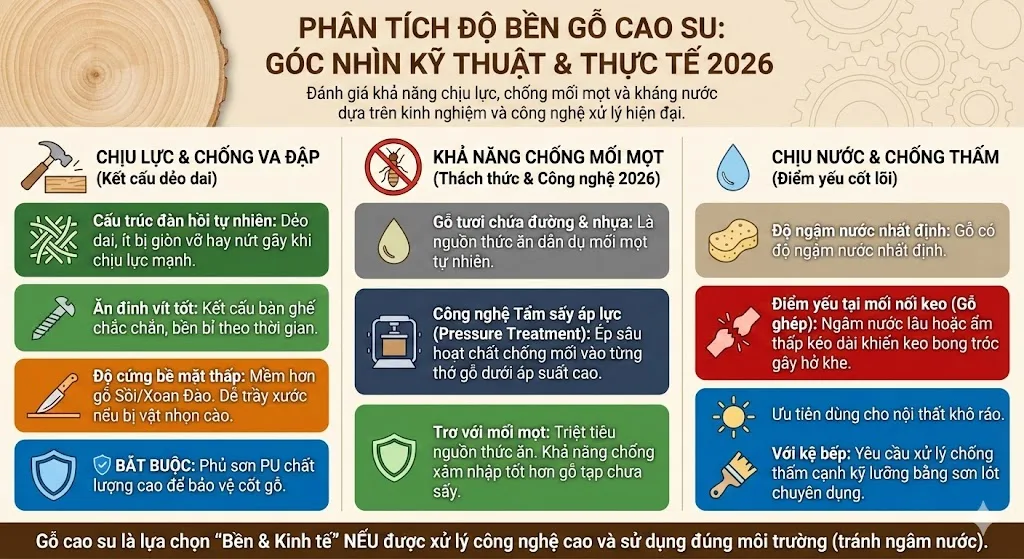 Dưới góc độ kỹ thuật và kinh nghiệm từ những thợ mộc lâu năm, độ bền của gỗ cao su được mổ xẻ qua ba khía cạnh chính.
