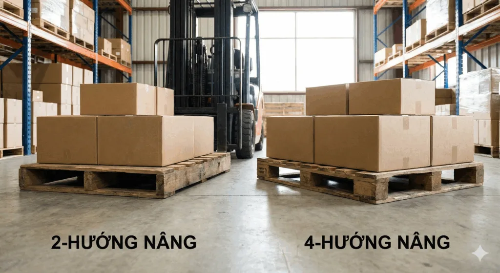 - Pallet gỗ cao su 2 hướng nâng và 4 hướng nâng: