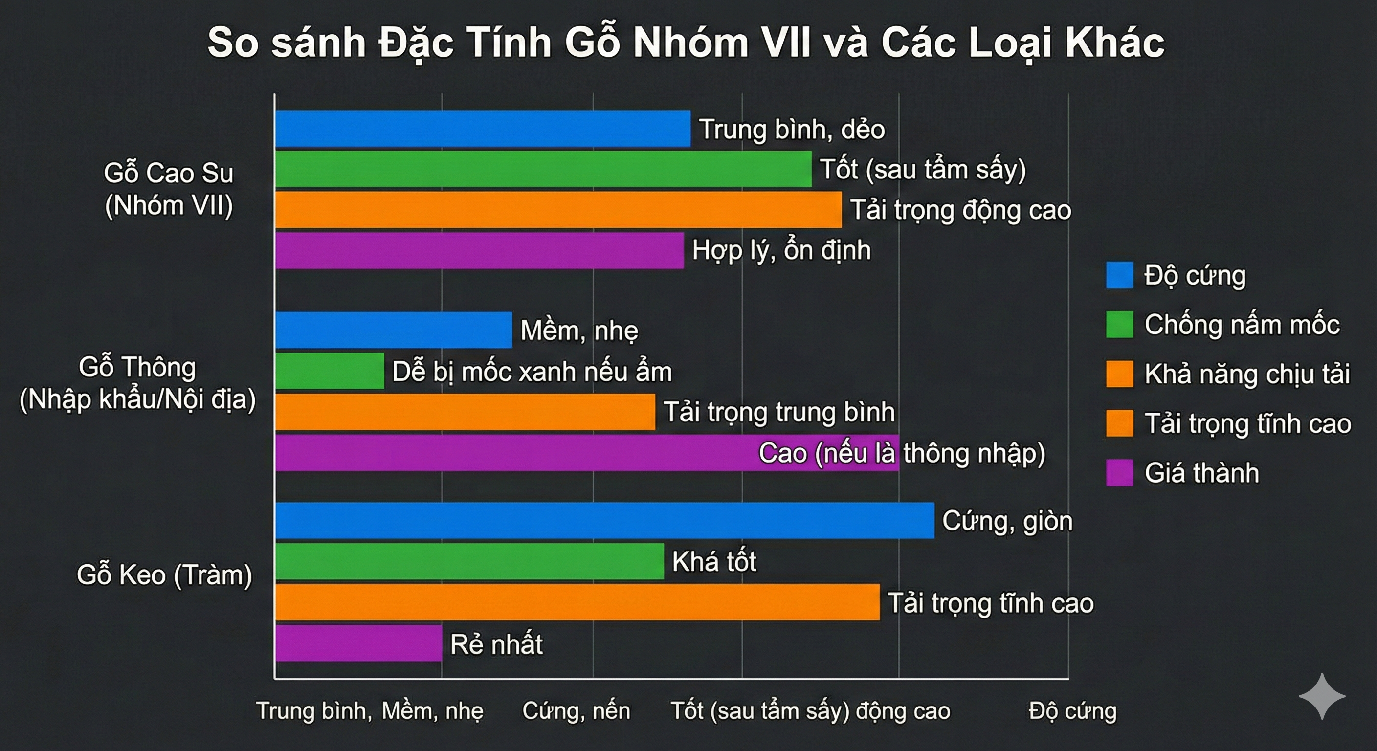 | Tiêu chí | Gỗ Cao Su (Nhóm VII) | Gỗ Thông (Nhập khẩu/Nội địa) | Gỗ Keo (Tràm) |