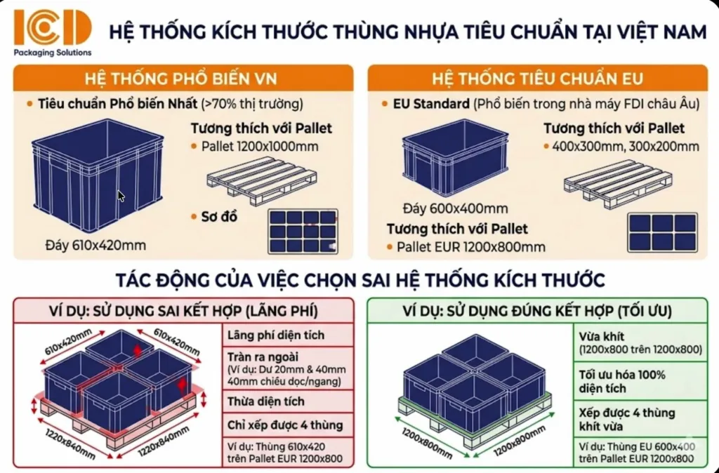 Thùng nhựa công nghiệp tại Việt Nam theo hai hệ thống kích thước chính.