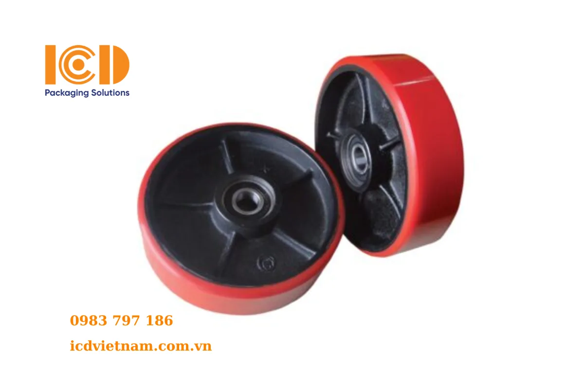 Đây là sự lựa chọn phổ biến nhất cho các kho hàng hiện đại. Bánh xe PU thường có cấu tạo lõi gang hoặc thép đúc, được bọc bên ngoài bởi lớp nhựa PU độ bền cao, thường có màu đỏ hoặc vàng.