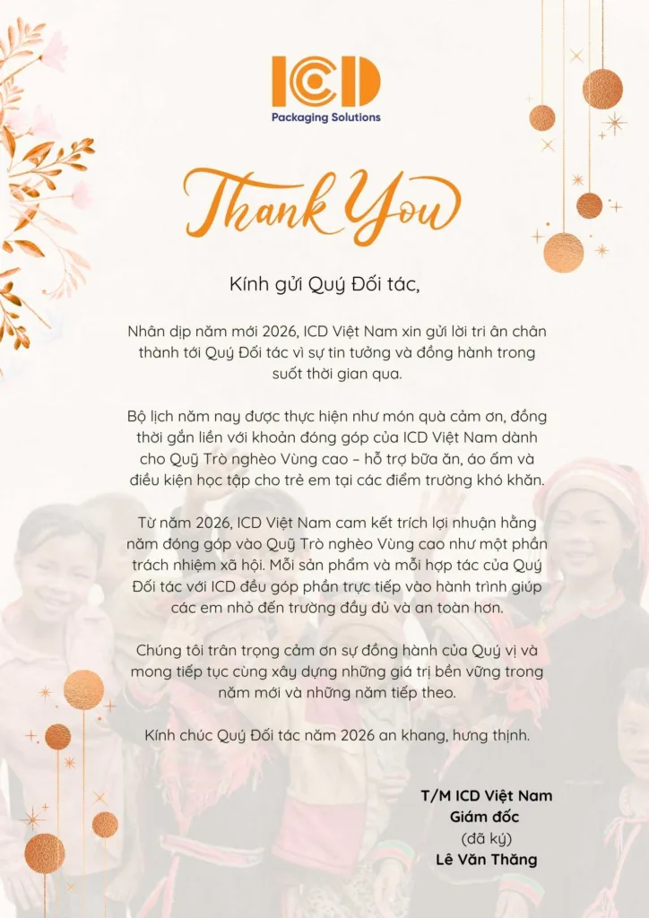 Chương trình nổi bật của công ty trong năm nay là bộ lịch Tết 2026. Đây không chỉ là món quà tri ân gửi đến Quý Đối tác, mà còn mang ý nghĩa sẻ chia khi ICD Việt Nam dành một khoản đóng góp vào Quỹ Trò nghèo Vùng cao – quỹ thiện nguyện hỗ trợ bữa ăn, quần áo ấm và điều kiện học tập cho trẻ em vùng cao Việt Nam.