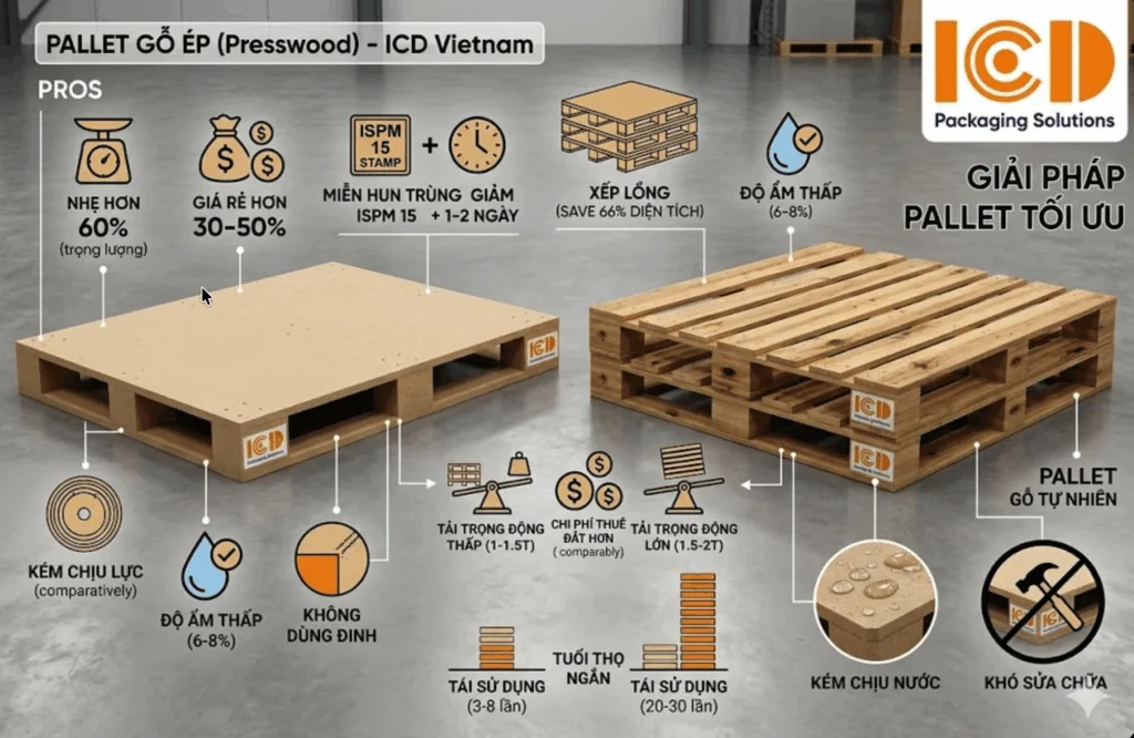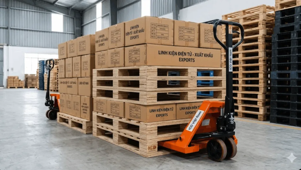 Pallet gỗ ép (gỗ dán) là giải pháp thực sự hiệu quả cho doanh nghiệp xuất khẩu hàng nhẹ với tần suất lớn, nhờ ưu điểm miễn hun trùng, giá rẻ và trọng lượng nhẹ. Tuy nhiên, không phải tình huống nào cũng phù hợp – hàng nặng, lưu kho dài hạn hoặc môi trường ẩm ướt đều cần cân nhắc chuyển sang pallet gỗ tự nhiên hoặc pallet nhựa. Nguyên tắc đơn giản nhất: hàng dưới 1 tấn, xuất khẩu 1 chiều → gỗ ép. Hàng trên 1,5 tấn hoặc cần tái sử dụng nhiều lần → gỗ tự nhiên. Liên hệ ICD Việt Nam để được tư vấn miễn phí và nhận báo giá trong 30 phút.