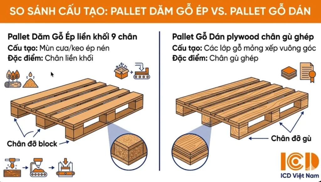 Trên thị trường hiện có hai loại chính mà nhiều người hay nhầm lẫn. Loại thứ nhất là pallet dăm gỗ ép (presswood pallet), được sản xuất từ mùn cưa và dăm gỗ nghiền mịn, trộn với nhựa nhiệt rắn rồi ép khuôn dưới áp suất cao. Sản phẩm này có đặc điểm nhận dạng dễ thấy: bề mặt nhẵn, đồng nhất, không có vân gỗ, thường có 9 chân đỡ liền khối. Loại thứ hai là pallet gỗ dán (plywood pallet), dùng các lớp gỗ mỏng (veneer) xếp vuông góc và dán bằng keo chuyên dụng. Pallet gỗ dán vẫn giữ được vân gỗ tự nhiên trên bề mặt, có tỷ trọng 600-700 kg/m3, và thường bền hơn loại dăm gỗ ép.